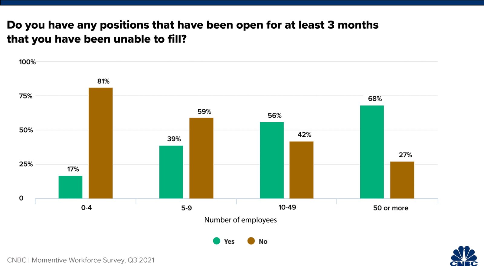 Almost one-third of small business owners say they have had open positions they are unable to fill for at least three months, double the level from a year ago, according to the Q3 2021 CNBC | Momentive Small Business Survey.